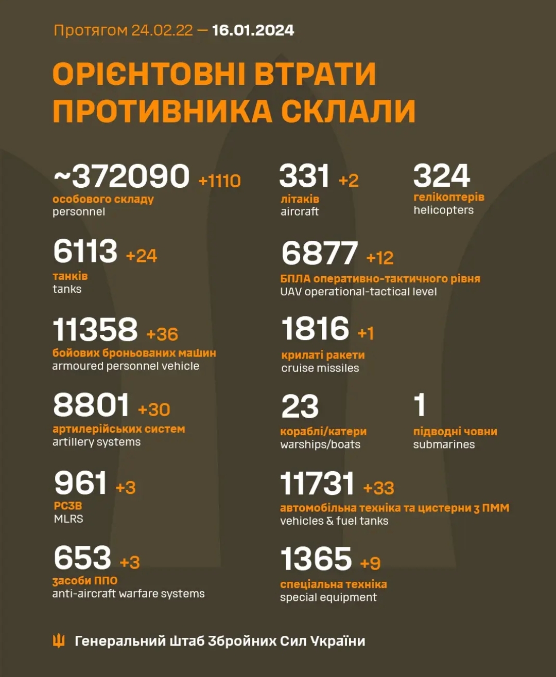Вражеская армия также стала меньше на 1 110 оккупантов. В итоге общие потери врага в личном составе, начиная с 24 февраля 2022 года, достигли 372 090 чел.