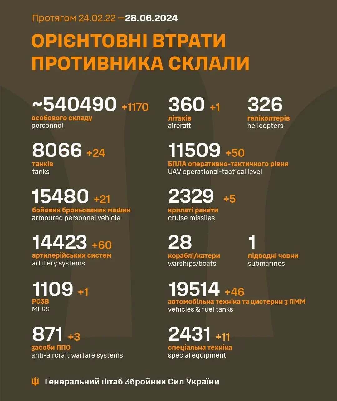 За даними Генерального штабу ЗСУ, за останню добу – 27 червня 2024 року було спалено 24 од. ворожих танків (за час повномасштабної війни – 8066 од.) та 21 од. бронетехніки (загалом – 15 480 од.). Також підбито 46 од. автомобілів та автоцистерн (сумарно – 19 514 од.) та 11 од. спецтехніки (загалом – 2 409 од.).