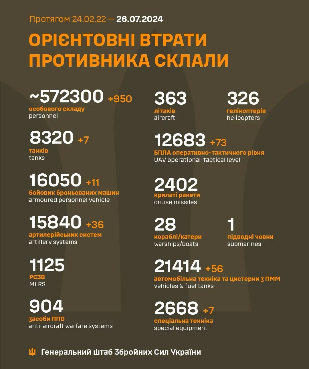 Сили оборони України ліквідували 950 російських окупантів. В результаті орієнтовні втрати армії рф в особовому складі, починаючи з 24 лютого 2022 року, досягли 572 300 осіб.
