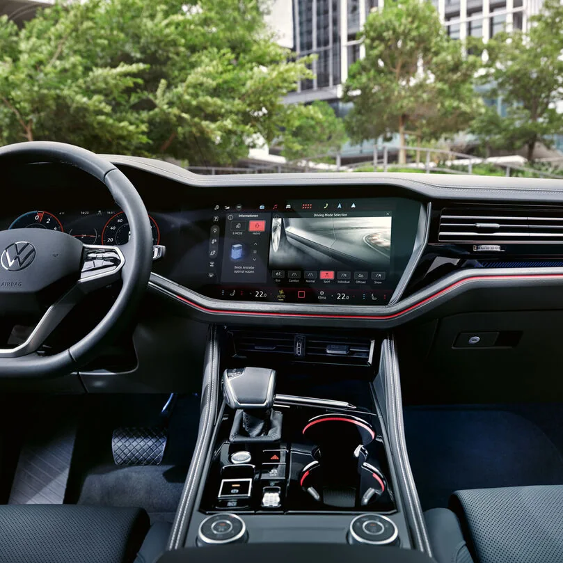Художники Volkswagen Design переосмыслили переднюю часть Touareg. Решетка радиатора подчеркивает ширину автомобиля, а новые матричные фары соединяются подсвеченной горизонтальной полосой. Нижние диффузоры стали больше, да еще имеют индивидуальный дизайн в зависимости от выбранной комплектации.