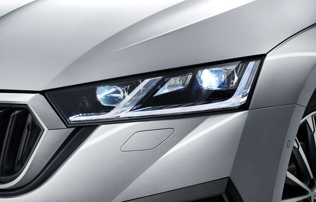 Новая Шкода Октавия за доплату может быть оснащена матричной диодной оптикой с управляемым пучком света. Кстати, уже в базовой версии фары светодиодные.