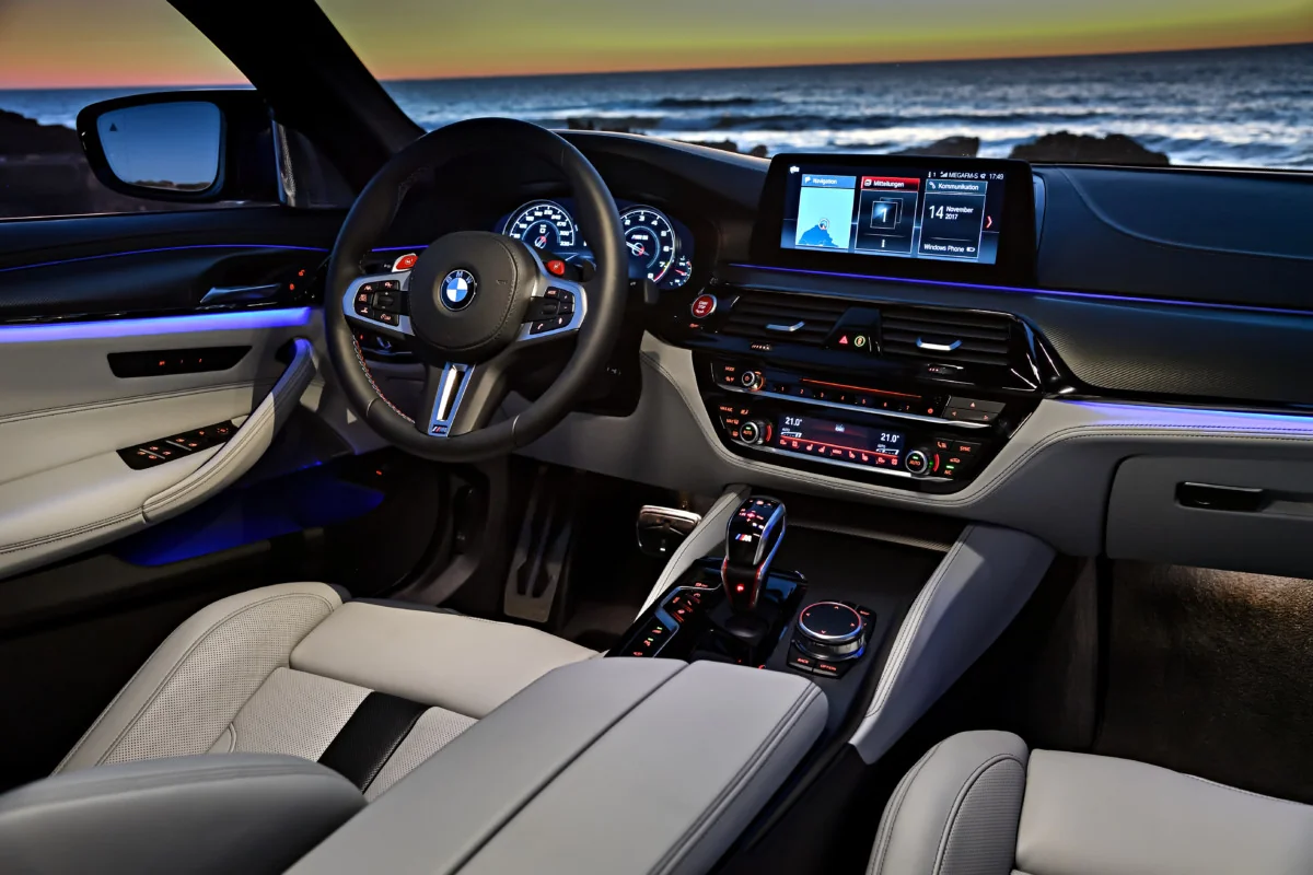 Плюсы: Новый BMW M5 позволяет получить максимальное удовольствие от вождения не только на гоночных треках, но и в повседневной эксплуатации. Мощный и тяговитый мотор вместе с автоматической трансмиссией и интеллектуальным полным приводом позволяют реализовать самые смелые драйверские амбиции владельца. При этом автомобиль гарантирует максимально высокий уровень комфорта и безопасности. Даже при выборе спортивного режима работы подвески не возникает дискомфорта во время езды.Минусы: Переключать режимы полного привода или отключать его вовсе можно только через меню медиасистемы. Маркие глянцевые вставки в оформлении салона достались в наследство от обычной 5 Серии. Рулевое колесо хотелось бы меньшего диаметра и не такое толстое.