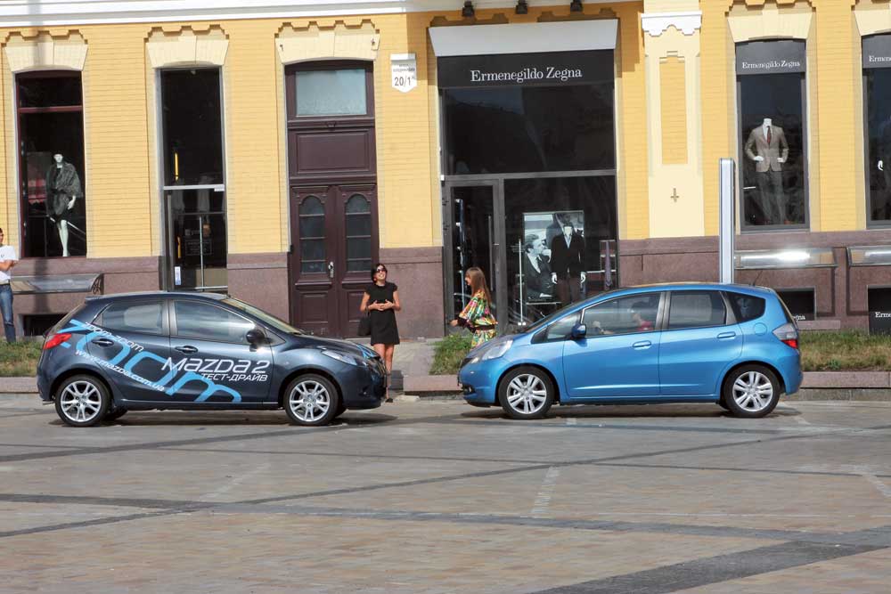 Внешне Mazda2 – довольно привлекательная машина. Ее стремительный облик больше импонирует представительницам прекрасного пола. Правда, цвет тестируемой «двойки» глаз не радует, хотя цветовая гамма модели довольно широка и включает яркие варианты. За счет короткого капота и высокой крыши Jazz похож не на хэтчбек, а скорее на семейный микровен. Но тестируемая Honda яркой раскраски, поэтому сразу притягивает взгляд.
