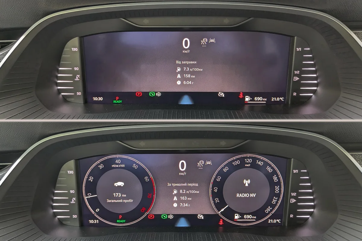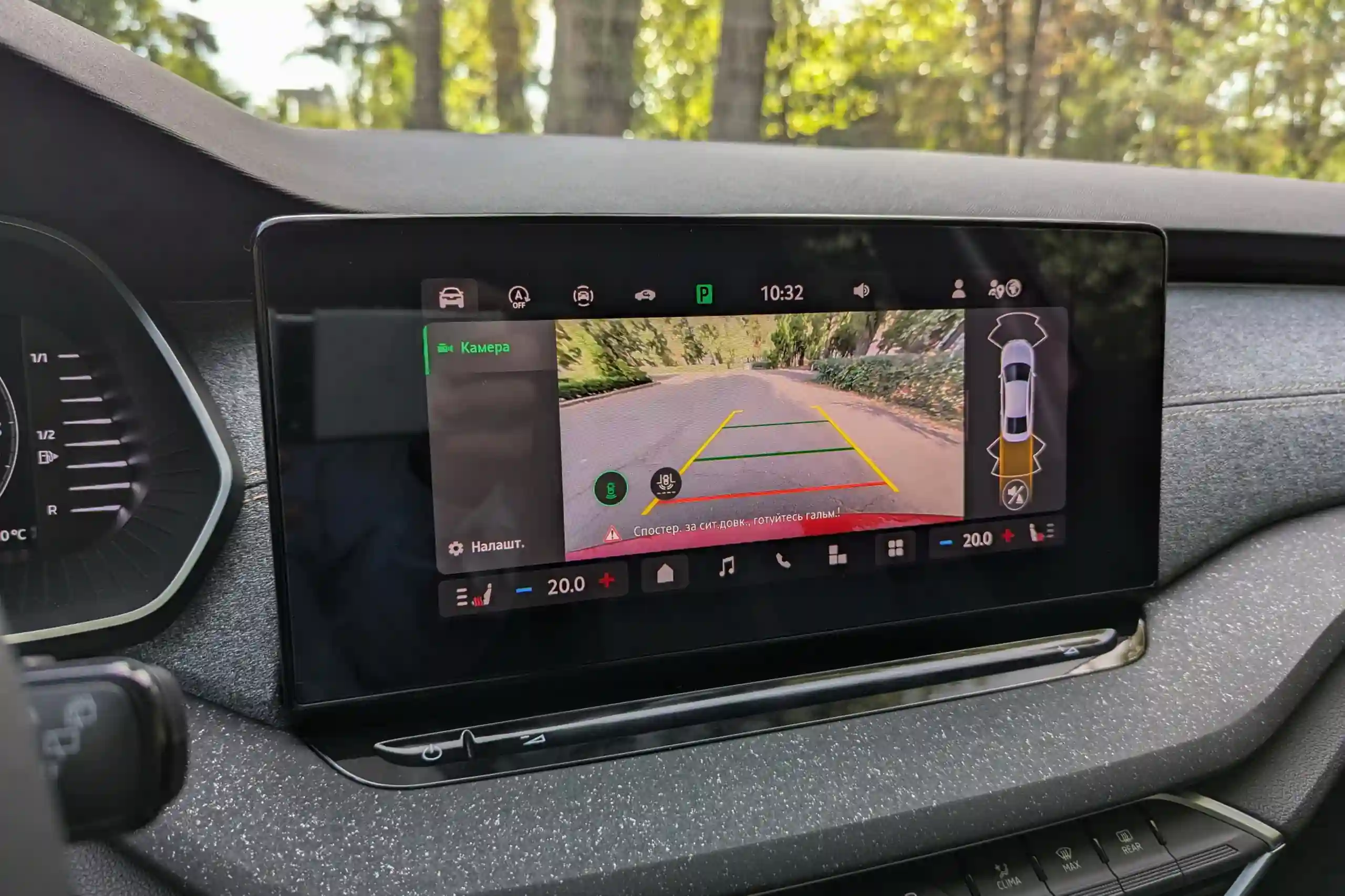 Доминирующими элементами салона являются опционная цифровая панель приборов Virtual Cockpit с 10-дюймовым дисплеем и 10-дюймовый дисплей информационно-развлекательной системы Skoda (на топовых версиях – 13-дюймовый). На них выводится множество полезной информации о работе электронных систем автомобиля, включая систему парковки последнего поколения. Изображение на приборной панели можно менять с учетом персональных предпочтений от лаконичной “картинки” с минимумом информации до развернутой красочной панели с традиционными шкалами спидометра и тахометра, а также различными оперативными данными.