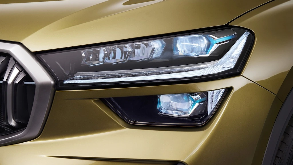 Общий стиль и пропорции модели Kodiaq сохранены. В новинки Рельефный капот, напоминающий Лэнд Круйзер 200, в решетке радиатора подсвечивающей горизонтальной линии, а решетки в бампере имеют 8-угольные ячейки. Раздельные фары оснащены вторым поколением LED-матричных фар. Фара имеет стреловидные дневные ходовые огни кристаллического дизайна. В новых фарах в половину больше световых сегментов, что обеспечивает на 15% больше света. Они также имеют приветственный анимированный режим.