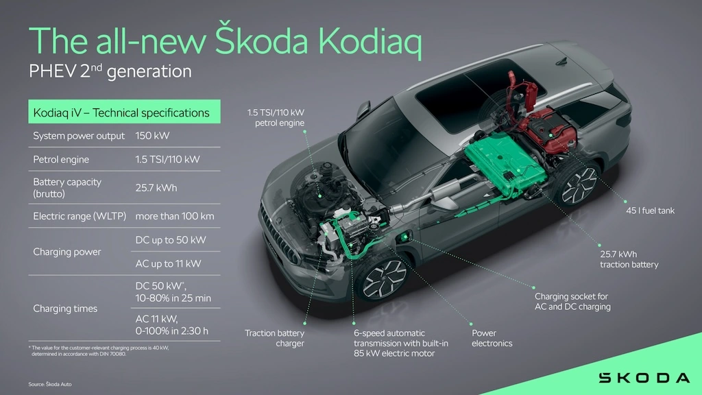 Но самое интересное – в гамме появился гибрид с возможностью подзарядки! Силовая установка плагин-гибрида, впервые появившаяся в Kodiaq, состоит из бензинового турбированного двигателя внутреннего сгорания 1.5 TSI с непосредственным впрыском топлива (150 л.с.), тяговой батареи на 25,7 кВт*часов, и электрического двигателя на 85 кВт (116 л.с.), интегрированного с 6-ступенчатой автоматической коробкой передач. Суммарная мощность силовой установки составляет 150 кВт (204 л.с.). Да, она не равна сумме мощностей двух двигателей, ведь работают они не в разных режимах. Интересно что как в плагин-гибридной, так в версии с мягким гибридом двигатель 1.5 TSI настроен не по классическому циклу Отто, а по более эффективному циклу Аткинсона, как у большинства гибридных авто.