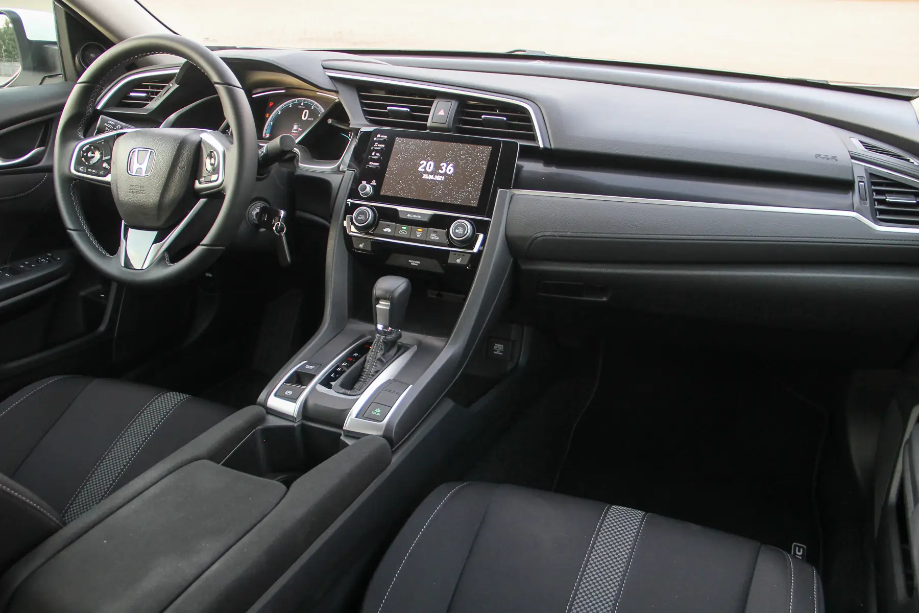 Салон отличается фактурной передней панелью и низкой посадкой. Конечно же, это легковая Хонда и по другому быть просто не может. В меру пухлый руль удобно ложится в руки, а селектор “автомата” (Civic комплектуется вариатором) благодаря высокому центральному тоннелю расположен максимально удобно. Автомобиль словно призывает тебя отправиться в путь!