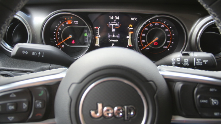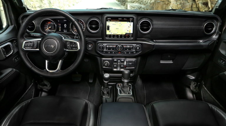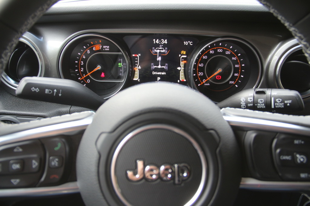 Рулевая колонка теперь регулируется по высоте и вылету. Рулевое колесо оснащено подогревом. У передних сидений улучшена боковая поддержка и уже в базовой версии они также оснащены подогревом. Несмотря на рамную конструкцию, салон Wrangler достаточно просторный. На втором ряду достаточно места, сиденья удобные и есть два USB-разъема для зарядки гаджетов.