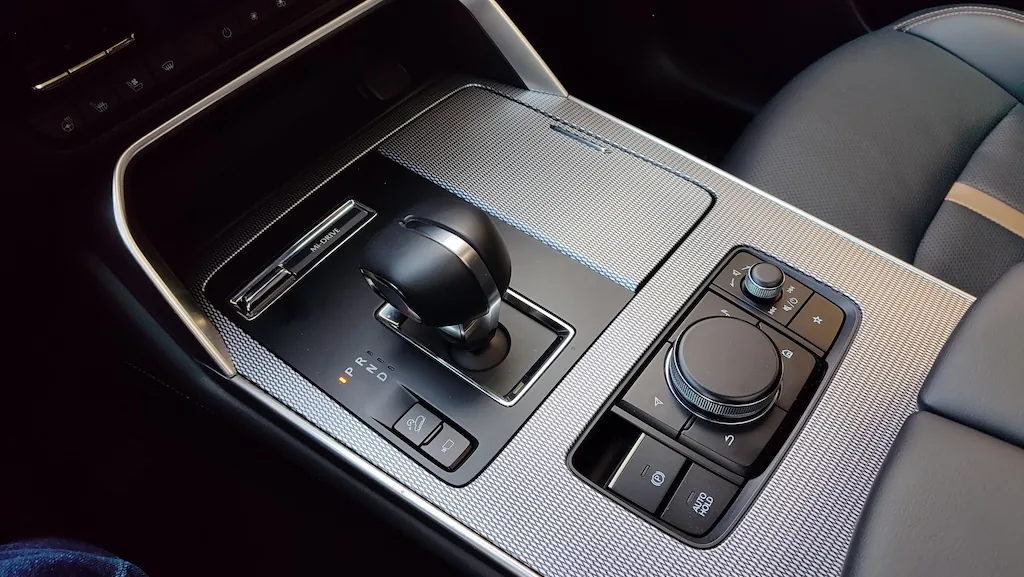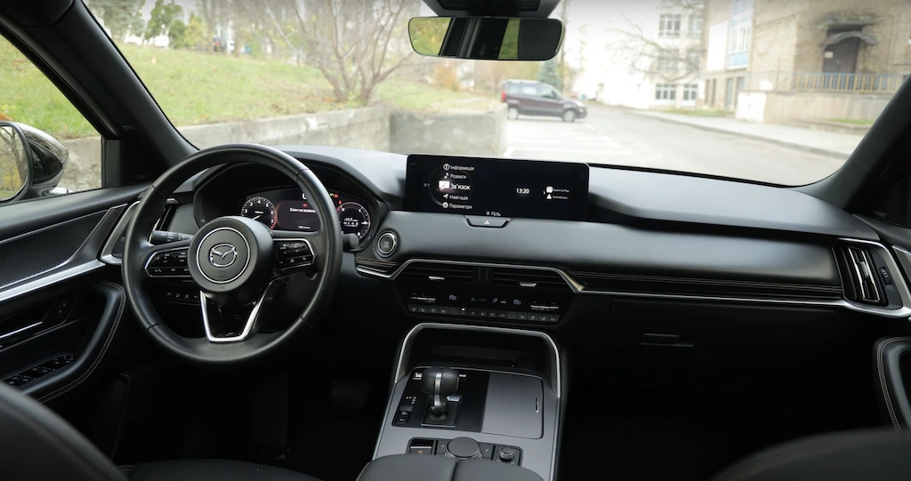 Посадка за рулем удобна – это касается и профиля сидений и взаиморасположения основных органов управления. Широкая центральная консоль одновременно и намекает на большие размеры Mazda CX-60 и ширину салона, и крадет свободное пространство у водителя и переднего пассажира. Но иначе и нельзя было сделать, ведь смещенный ближе к центру автомобиля двигатель подвинул также и автоматическую коробку передач.