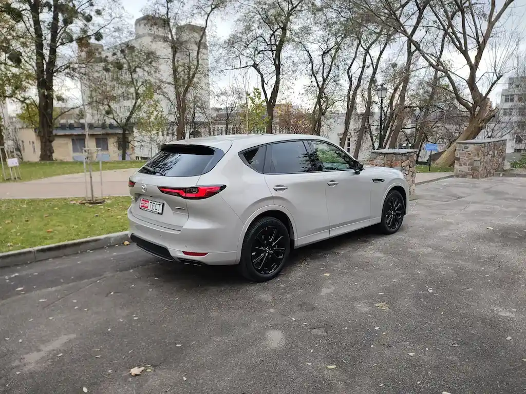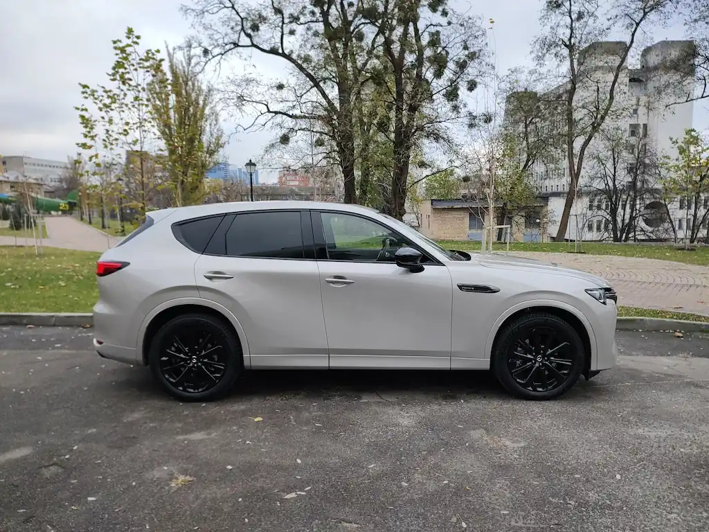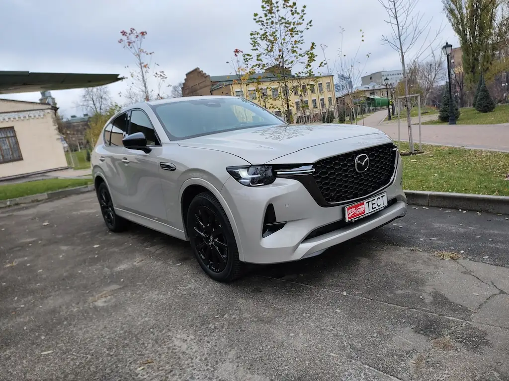 Внешне кроссовер выглядит элегантно, что подчеркнуто новым светлым оттенком Rhodium White, в который окрашен тестовый автомобиль. Впрочем, фирменный красный Soul Red Crystal, уже в известной степени ставший визитной карточкой Mazda, также предлагается.Чистый и спокойный дизайн CX-60 отличается плавными изгибами панелей, создавая интересную игру света и тени, что особенно заметно в бортах кроссовера. Такая техника даже получила у дизайнеров название «смелое движение света».