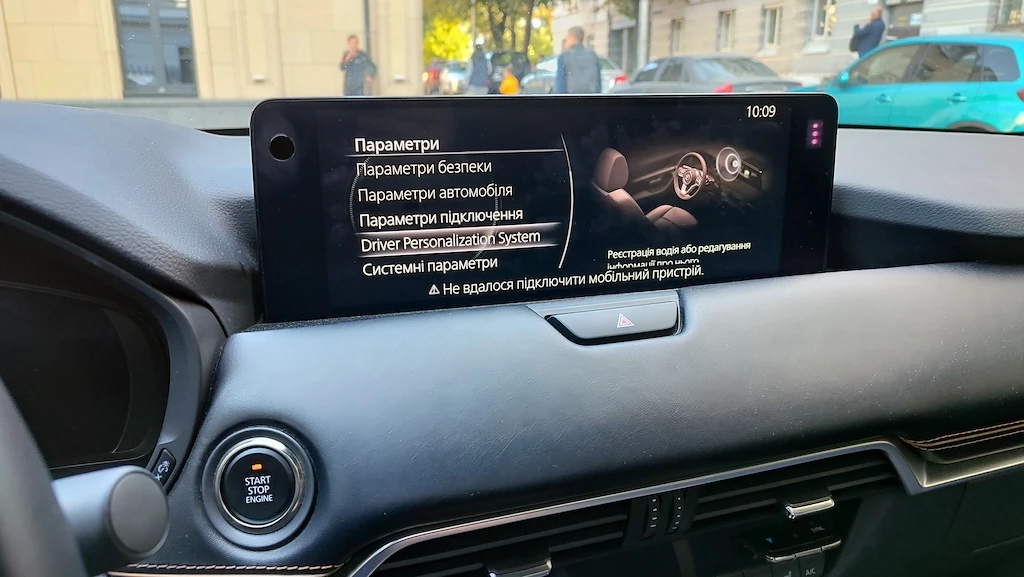 Как утверждают дизайнеры Mazda, они стремились создать интерьер спокойным, элегантным и утонченным - так что рассматривая его с водительского места могу это засвидетельствовать. Линии дизайна лаконичны и спокойны, а среди материалов мягкие пластики, кожа и вставки под алюминий. Сидение украшено кожей Nappa, что является особенностью комплектации Premium. Также среди преимуществ этой комплектации (если говорить о салоне) вентиляция передних сидений, электрическая регулировка руля, безрамочное зеркало, панорамный люк, акустика Bose на 12 динамиков и система персонализации Driver Personalization System. Она интересна тем, что достаточно создать личный профиль в системе, задать свой ник и указать рост. Система сама предлагает водителю подстройку кресла, руля и наружных зеркал. С помощью камеры авто каждый раз распознает водителя, когда он садится за руль, и активирует профиль с сохраненными настройками положения сиденья, руля, его плейлист аудио. Для семейного авто, где часто сменяются водители, это удобно.