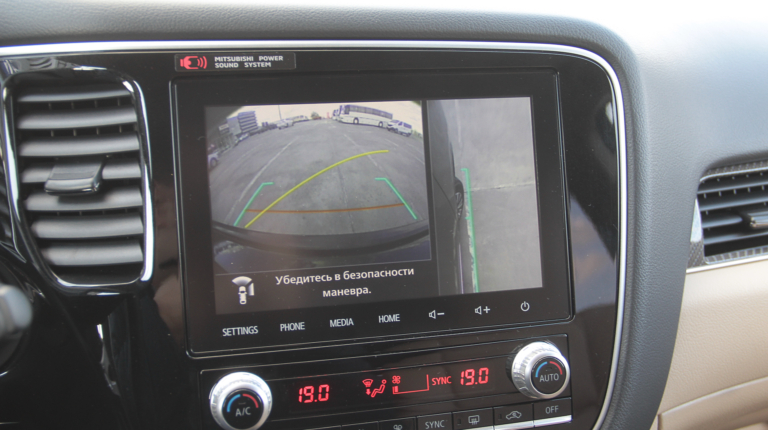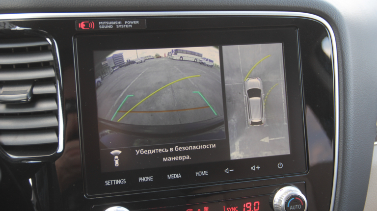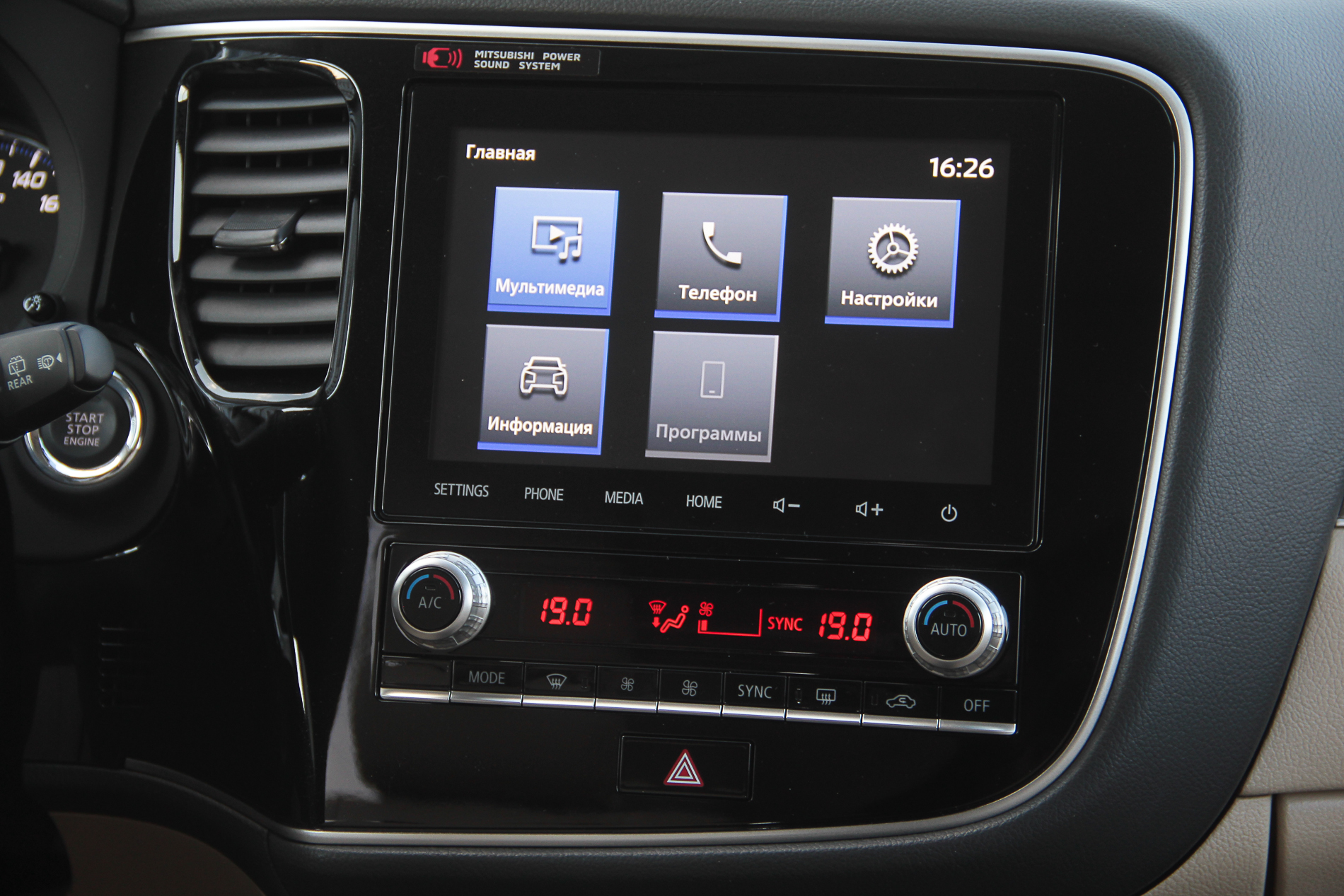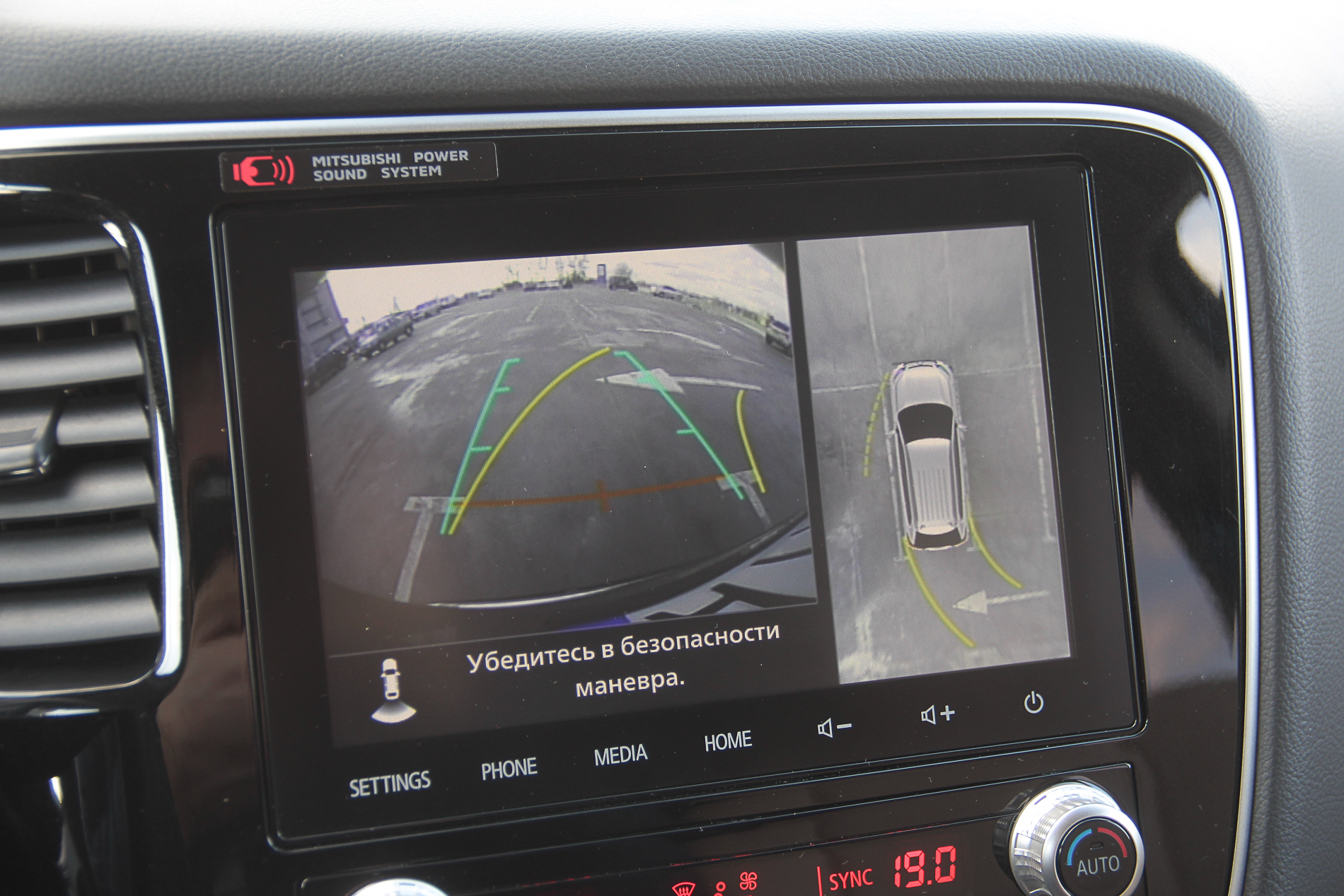Что касается новой мультимедиа, то теперь на ней не красуется надпись Rockford Fosgate. Ее заменила наклейка Mitsubishi Power Sound System со смешным значком, похожим на электрошокер. Если честно, то можно было и без нее. Ну какая наклейка на выполненном заподлицо экране и окружающем ее рояльном лаке? Говоря о функционале стоит отметить, что встроенной навигации здесь нет, ставка сделана на подключение смартфона. А камера кругового обзора просто отлична – и картинка, и углы обзора, и траектории.
