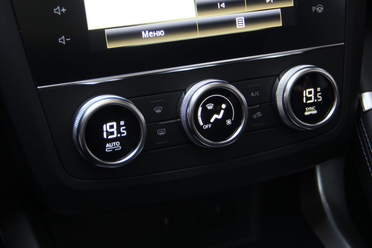 А вот у команды, работавшей над интерьером, задачи были масштабнее. Поэтому и перемены в салоне заметнее и видны они сразу! В Рено решили избавиться от ниссановского наследия и по-другому вписали в центральную консоль мультимедийную систему R-Link 2, “накрыв” ее большим глянцевым стеклом, а также полностью заменили блок двухзонного климат-контроля. Теперь это три вращающиеся шайбы со вписанными внутр экранами, которые по совместительству являются кнопками. Стильное, эргономичное и в целом удачное исполнение данного блока, подмеченное нами на тесте Renault Duster в прошлом году – именно там оно появилось впервые.