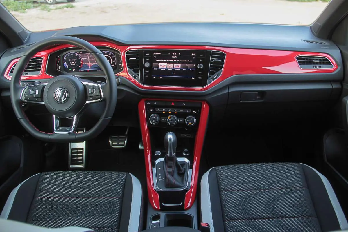 Скроенный по классическим лекалам Volkswagen, салон T-Roc мог бы и не вызывать ярких эмоций, если бы не несколько весомых “но”. И главное из них - цветные вставки на передней панели и в дверных картах. Нет, это даже не вставки, а исполнение интерьера в красно-черном цвете! Отлично сочетается с цветом кузова и очень здорово оживляет весь салон.