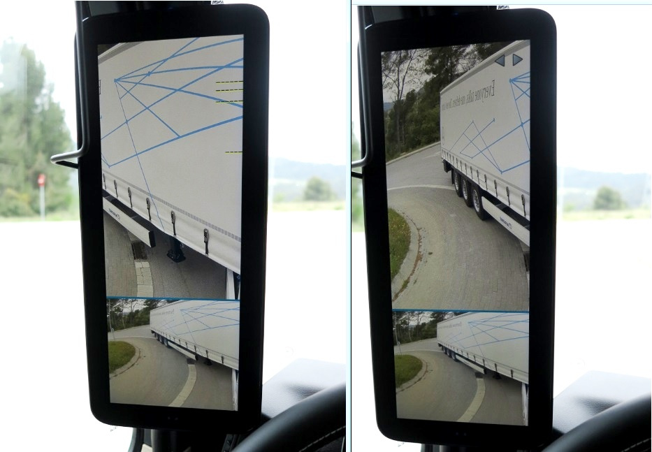 Вторая фишка – два 15-дюймовых экрана системы MirrorCam, на которые передается изображение с двух видеокамер, которых размещаются на месте привычных наружных зеркал. Причем это стандартное оснащение, по крайней мере для европейского рынка, где классические зеркала предлагаются уже только в качестве опции. Эти дисплеи хорошо читаются, причем яркость их может регулироваться вручную. В процессе движения и выполнения поворотов изображение на экранах подстраивается электроникой так, что водитель всегда видит окончание автопоезда.