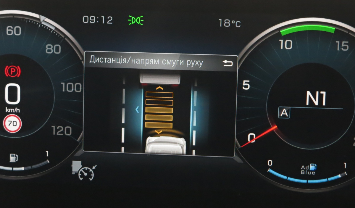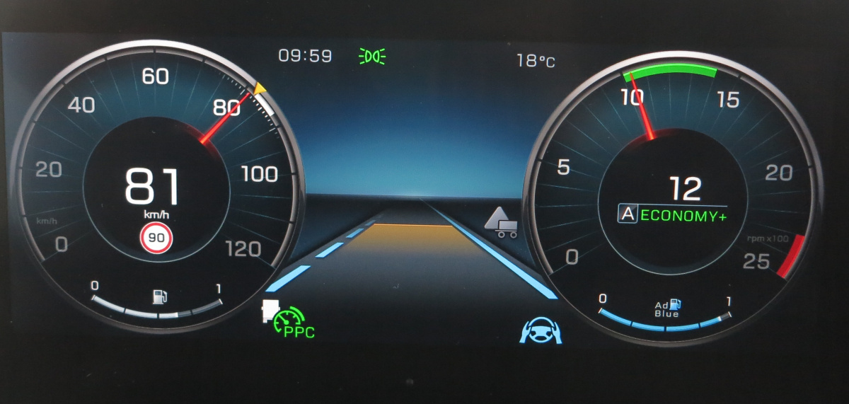 Что действительно хотелось проверить на дорогах общего пользования, так это работу системы полуавтономного управления Active Drive Assist. После нажатия соответствующей кнопки на правом экране тачскрин, включается режим полуавтономного управления, о чем свидетельствует голубой значок руля, загорающийся на основном щитке приборов. И автопоезд во время движения на любой скорости автоматически удерживается на полосе движения, в том числе и в плавных поворотах.