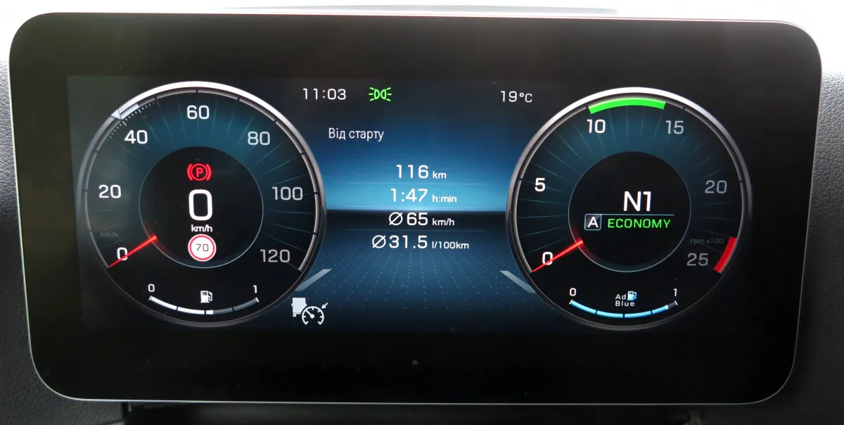 Цифровая приборная панель разделена на два экрана. Тот, что непосредственно за рулем имеет диагональ 12 дюймов, высокое разрешение и заменяет аналоговый щиток приборов. Водитель может выбрать классическую комбинацию приборов Classic – с двумя циферблатами спидометра и тахометра, или передовую Advanced – c крупным цифровым спидометром по центру и другими показателями по бокам. Мы выбрали сначала классическую комбинацию, тем более, что на презентованных осенью прошлого года машинах она еще не была активирована.