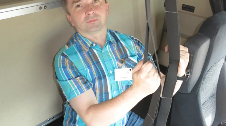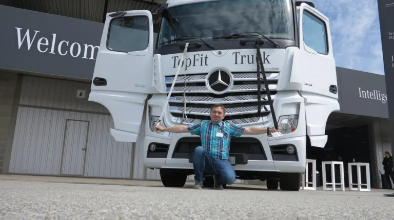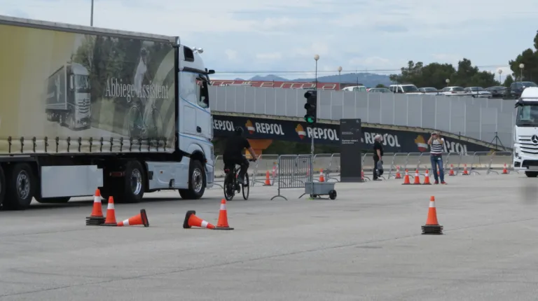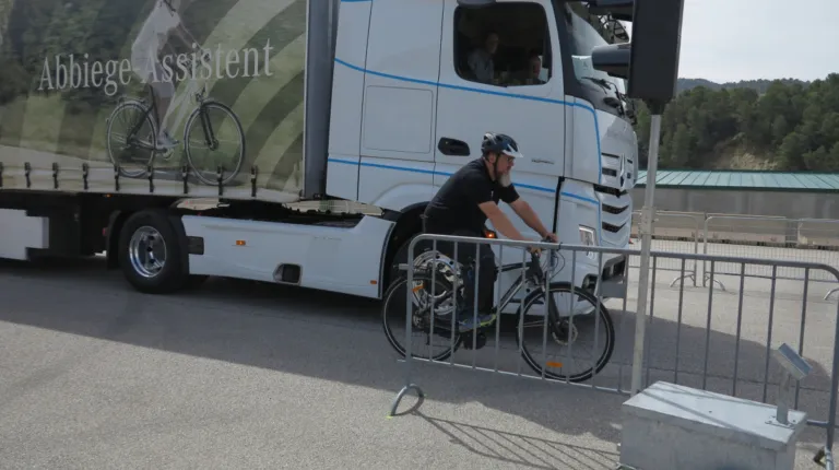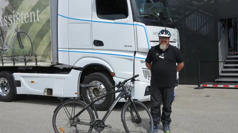 На специальном полигоне каждый желающий смог проверить работу системы Sideguard Assist, которая появилась на грузовиках Actros еще в 2016 году. Теперь же она была интегрирована в систему камер обзора MirrorCam. Суть ее заключается в устранении мертвых зон у правого переднего колеса, а также в районе заднего свеса тягача/прицепа. Именно в эти зоны чаще всего попадают велосипедисты и пешеходы. Система сканирует до 2 метров впереди автомобиля/автопоезда и до метра позади него, эффективно помогая на сцепках длиной до 18,75 м. Работает она следующим образом: в случае обнаружения человека в указанных мертвых зонах на экранах MirrorCam начинает светиться желтый треугольник, а в случае угрозы столкновения – красный и раздается звуковой сигнал. Sideguard Assist не вмешивается в тормозную систему и рулевое управление, а только предупреждает водителя.