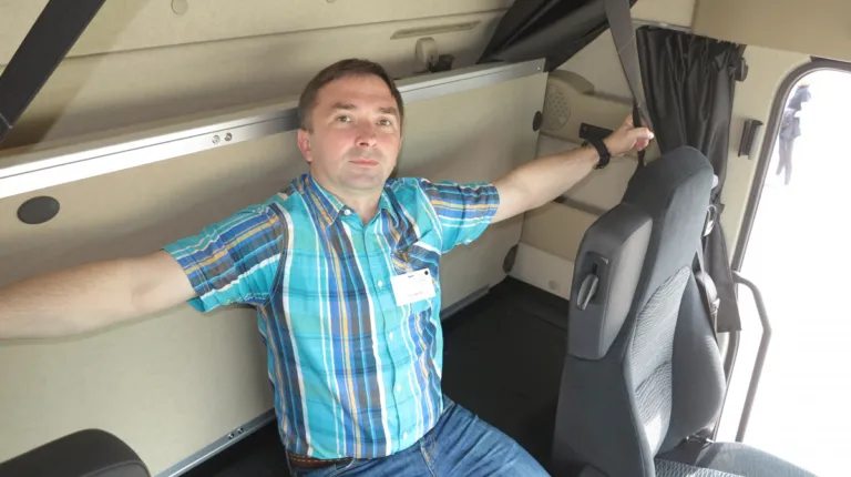 Самое необычное в интерьере нового магистрального тягача – цифровая приборная панель Multimedia Cockpit и экраны MirrorCam на передних стойках вместо традиционных наружных зеркал.