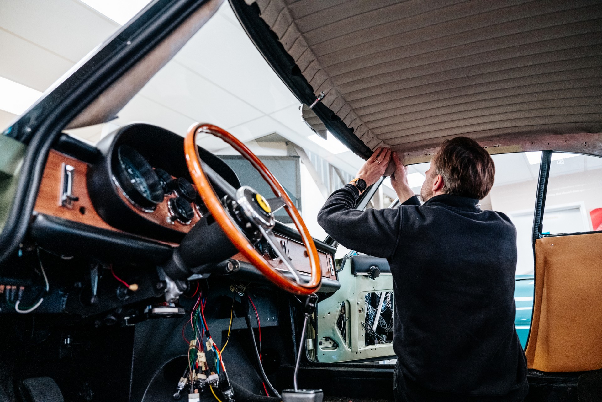 Потолок и пол отделали материалами, соответствующими тому времени. Самым сложным, по словам тюнеров, было восстановление приборной панели. Деревянный шпон очень износился и им пришлось испробовать много методов, чтобы вернуть ему достойный вид.