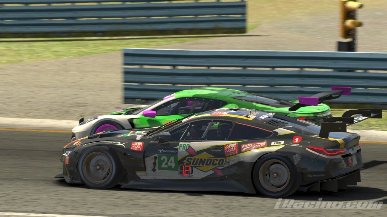 Вот что рассказывает Максим: «Попали с Алексеем в самый быстрый сплит 6:00 Watkins Glen. У нас с ним очень быстро и беспроблемно нашелся общий взгляд на подход к машине и том, какие настройки должны быть. После тренировок и корректировок, машина поехала еще стабильнее и быстрее и в результате мы показали почти одинаковое время. Были шансы с таким временем и стабильностью попасть в первую десятку, но немного не получилось. После старта гонки, с началом первых обгонов машинами LMP2 нас, как круговых, нагло и жестко выдавила в отбойник одна из машин. После чего пришлось ремонтировать машину. Она поехала потом так же хорошо, как и в начале гонки, и пришлось отражать позиции. Сплит был по быстрым пилотов, но мы все равно смогли закончить гонку на 12 позиций с 19 машин в нашем классе. Если бы нам не помешала машина из класса LMP2, то у нас получилось бы побороться за первую восьмерку. Впрочем, было как всегда интересно, получил очередной опыт. Кстати, мы были единственной BMW M8 GTE, а основная часть машин была Corvette».