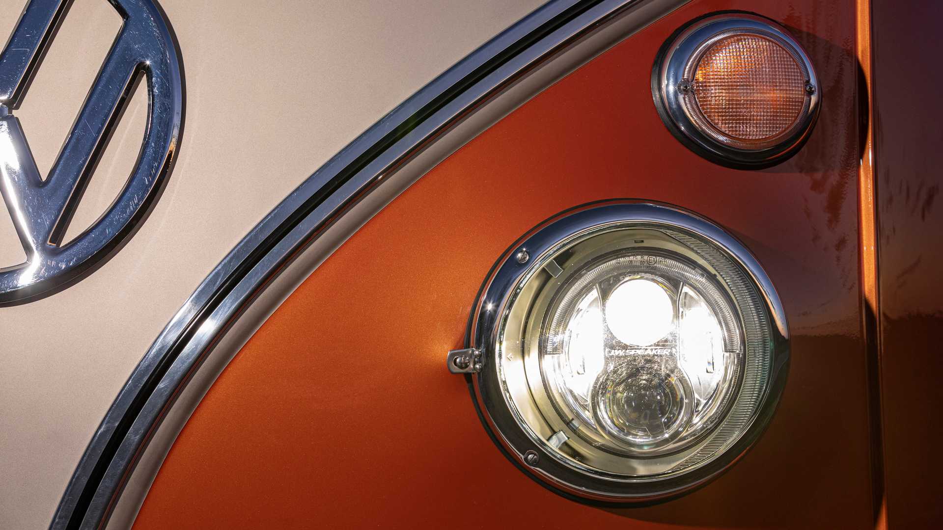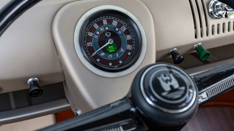 Тонкие модификации интерьера и экстерьера отличают e-Bulli от неизменной классики. Он оснащен светодиодными дневными ходовыми огнями, встроенными в фары, а также имеет светодиодный индикатор заряда снаружи. Внутри главной модификацией, которую вы можете заметить, является добавление современного автоматического переключателя передач VW, а также кнопки start/stop и цифрового дисплея, встроенного в стандартный аналоговый спидометр.