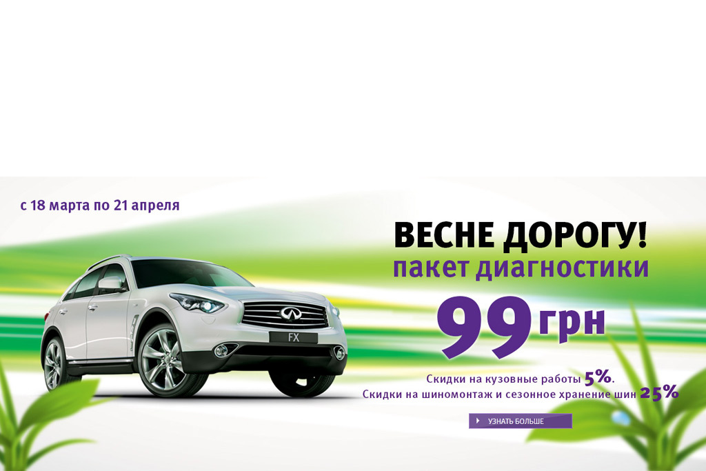 С учетом украинской погодной и эксплуатационной специфики, специалисты первого официального дилера Infiniti в Украине включили в акционный пакет действительно самые актуальные опции. К примеру, весеннее исчезновение дорог не могло не сказаться на корректной работе и состоянии ходовой части. Ее тщательную диагностику и рекомендации по устранению неисправностей на высоком качественном уровне проведут специалисты станции.