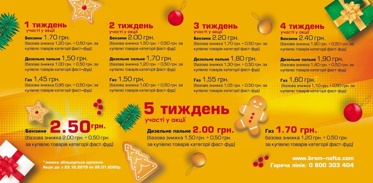 Протягом п’яти казкових тижнів, з 23 грудня 2019 по 26 січня 2020, при заправці будь-якого об’єму будь-якого палива на всіх АЗК БРСМ-Нафта, ваша знижка збільшуватиметься до 2,5 гривень на кожному літрі.