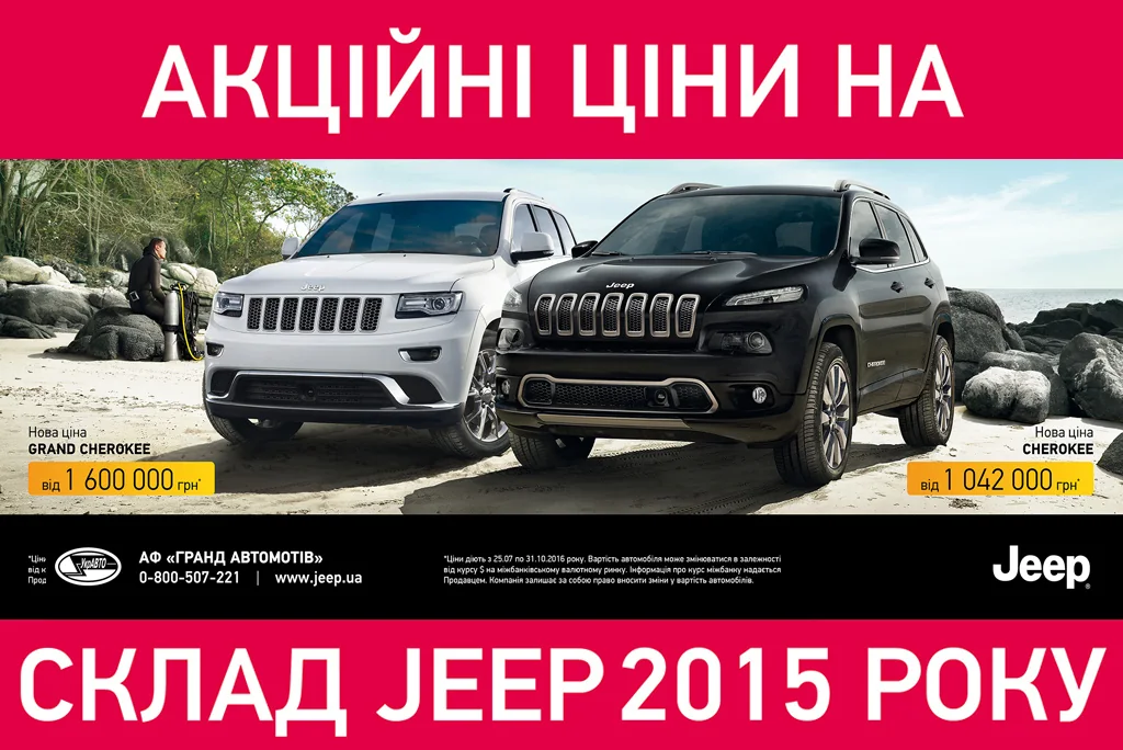 На ряд доступных на складе модификаций акционных автомобилей Jeep Cherokee и Grand Cherokee 2015 года цены снижены, а курс зафиксирован на отметке 24,5 грн. Кроме того, на автомобили Jeep Compass 2014 года и Jeep Wrangler 2015 года курс зафиксирован на отметке 25 грн.