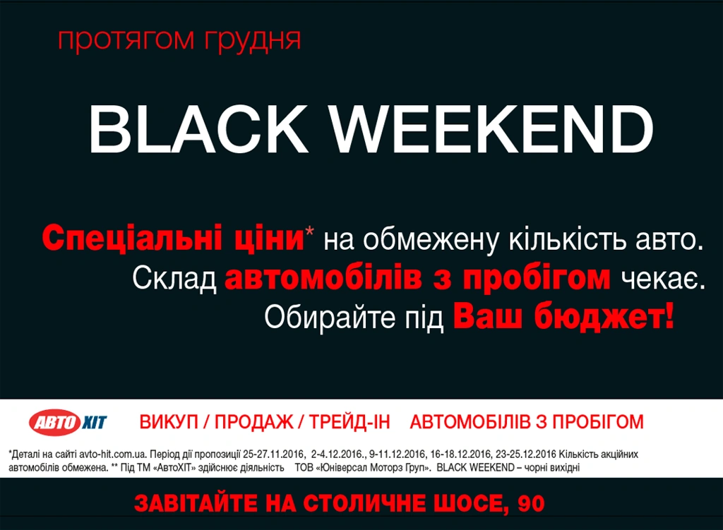 www.avto-hit.com.ua https://www.facebook.com/AvtoHIT.com.ua * Цены на автомобили указаны по состоянию на 25.11.2016. Продавец оставляет за собой право изменять цены. Перечень автомобилей со специальными ценами может меняться. Специальные цены действуют: 02-04.12.2016, 09-11.12.2016,16-18.12.2016, 23-25.12.2016. Количество автомобилей по специальной цене ограничено. Детали на сайте www.avto-hit.com.ua. ** Кредитует ПАО «Кредобанк» (лицензия НБУ № 43 от 11.10.2011) BLACK FRIDAY - Черная пятница. BLACK WEEKEND - Черные выходные.