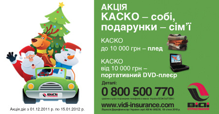 До 15 января 2012 г. в СК «ВиДи Страхование»* действует акция «КАСКО – себе, подарки – семье»**. По условиям акции каждый, кто оформит полис КАСКО в СК «ВиДи Страхование» в акционный период, гарантированно получит приятный подарок. Обладатели страховок стоимостью до 10 000 грн получат уютный теплый плед, а владельцы страховок стоимостью свыше 10 000 тыс. грн – портативный DVD-плеер*** с автомобильным адаптером, что позволит пассажирам просматривать фильмы в длительных автомобильных поездках без подзарядки батареи плеера.