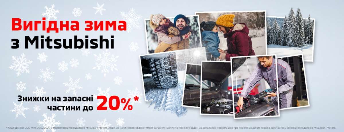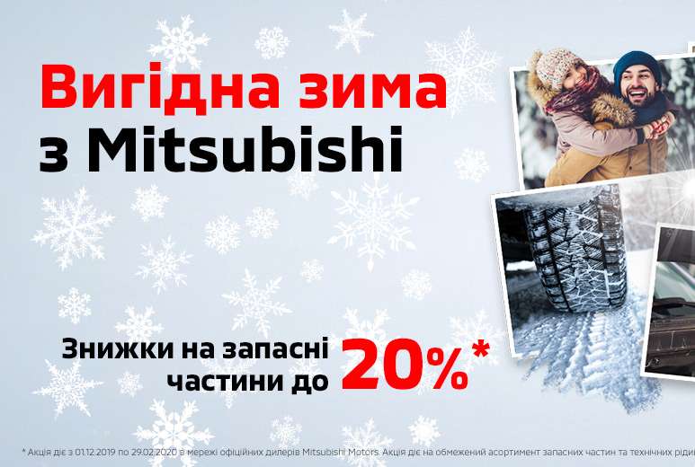 *Акція діє з 1 грудня 2019р. по 29 лютого 2020р. включно в мережі офіційних дилерів Mitsubishi Motors в Україні. Акція діє на обмежений асортимент, склад запасних частин і технічних рідин. За детальною інформацією про перелік акційних товарів, а також – про співвідношення цін без вигоди і з вигодою, звертайтеся до офіційних дилерів Mitsubishi Motors в Україні.