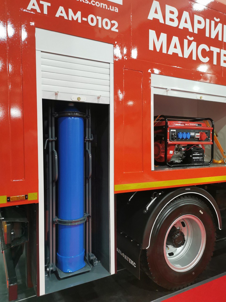Почнемо з аварійно-ремонтної майстерні АТ АМ-0102. Виробництво таких необхідних сьогодні машин для водоканалів та підприємств теплоенерго компанія Альфатекс» освоїла ще торік. На шасі автомобіля Dayun CGC1100 встановлено кузов-фургон, розділений на два відсіки. Перший – пасажирський, призначено для перевезення ремонтної бригади. Тут є зручні сидіння на шість осіб, оснащені пасками безпеки, відкидний столик, полиці для речей, а також вентиляційний люк у стелі.