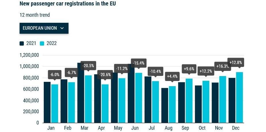 В тоже время, в последние пять месяцев прошлого года регистрации автомобилей в ЕС возрастали. Так в августе прирост составил 4,4%, в сентябре — 9,6%, в октябре — 12,2%, в ноябре — 16,3%, в декабре 12,8% к тому же месяцу 2021 года. Особенно результативными в конце года оказались Германия (+38,1) и Италия (+21%). Французский рынок был достаточно стабильным (-0,1%), тогда как Испания пережила падения продаж на 14,1%.