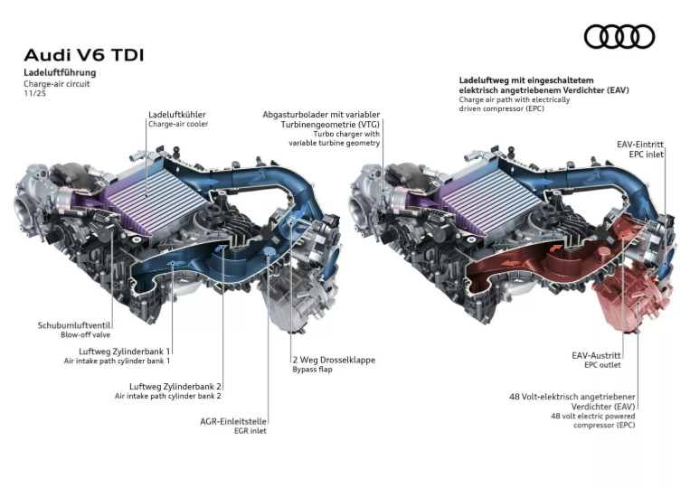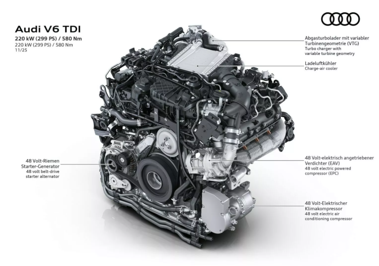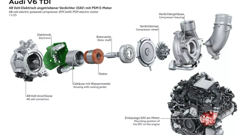 Вернуть в производство планируют двигатель EA897, но с определенными доработками и новым индексом EA897evo4. Специалисты Audi этот 3,0-литровый турбодвигатель V6 дополнили мягкой гибридной системой и электрическим компрессором. Причем 48-вольтовая надстройка в модели сочетается с электроприводом компрессора, установленным после турбины и интеркулера.
