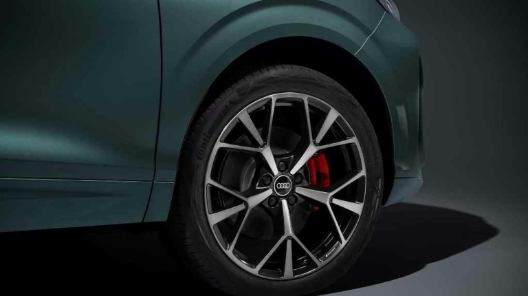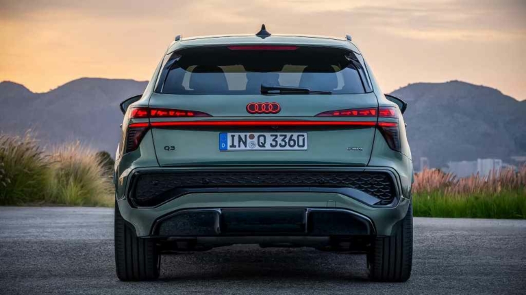 Корма Q3 выглядит не менее стильно и современно. Здесь внимание привлекает тонкая светодиодная полоса которая растянулась во всю ширину кроссовера. А над ней находятся узкие фонари и подсвеченный логотип марки. Также есть большой искусственный воздухозаборник, который закрывает задний бампер и находится над отделкой диффузора. Ездит новый кроссовер 17-дюймовых колесных дисках, за доплату они могут быть 20-дюймовыми. Коэффициент лобового сопротивления был снижен с 0,32 до 0,30.