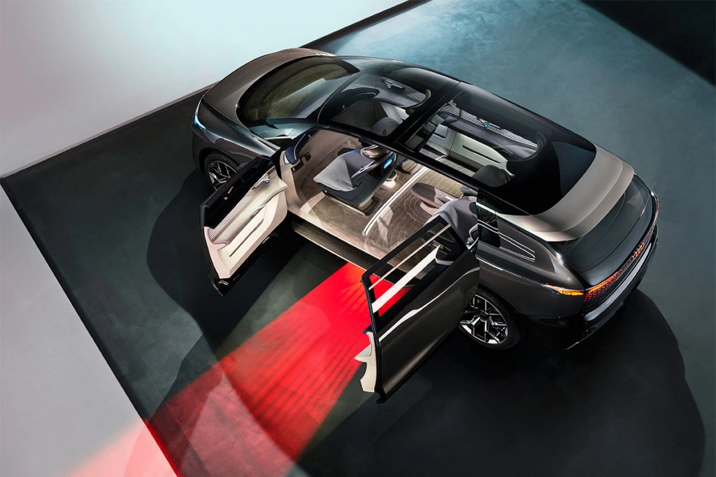 Всю переднюю панель дисплей, протянувшийся от водительской до пассажирской двери. Минивэн оснащен системами автономного управления четвертого уровня. При активации автопилота рулевое колесо и педали прячутся в переднюю панель и отключается проекция «приборки» на деревянные поверхности под лобовым стеклом.