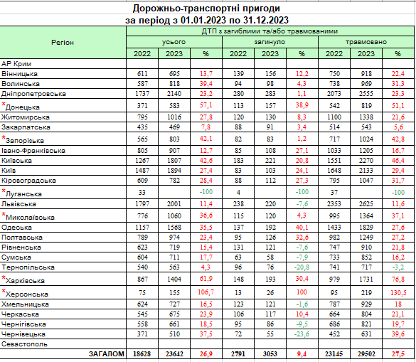Смертность в ДТП за год увеличилась на 9,4% достигнув показателя в 3053 человека. Еще 29 502 человека получили травмы различной степени тяжести. По сравнению с 2022 годом этот показатель вырос на 27,5%. Худшие показатели относительно смертности на дорогах в Днепропетровской (283 человека), Киевской (221 человек) и Львовской областях (220 человек). При этом Черновецкая и Тернопольская области наоборот в отчетном периоде показали положительную динамику. В этих регионах смертность на дорогах снизилась на 23,6 и 20,8% соответственно.