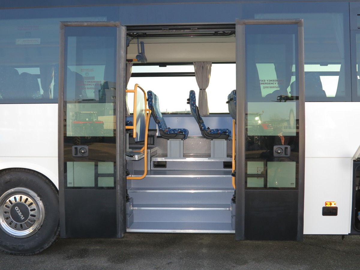 IVECO Crossway Line имеет две двери. В данном случае – переднюю, шириной 800 мм и среднюю – 1200 мм. Последнюю также можно заказать шириной 800 мм, что даст возможность установить два дополнительных сиденья. В салоне есть четыре кнопки Stop (укр. «вимога зупинитись»), которая сигнализирует водителю о том, что пассажир хочет выйти на ближайшей остановке.