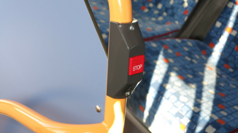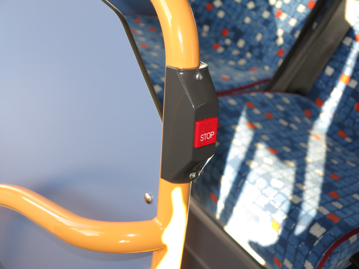 Есть кнопка блокировки автобуса на остановке. Она задействует стояночный тормоз и включает функцию kneeling – наклона кузова в сторону тротуара, что облегчает посадку-высадку. При нажатии на педали газа функция отключается – и автобус готов ехать дальше.
