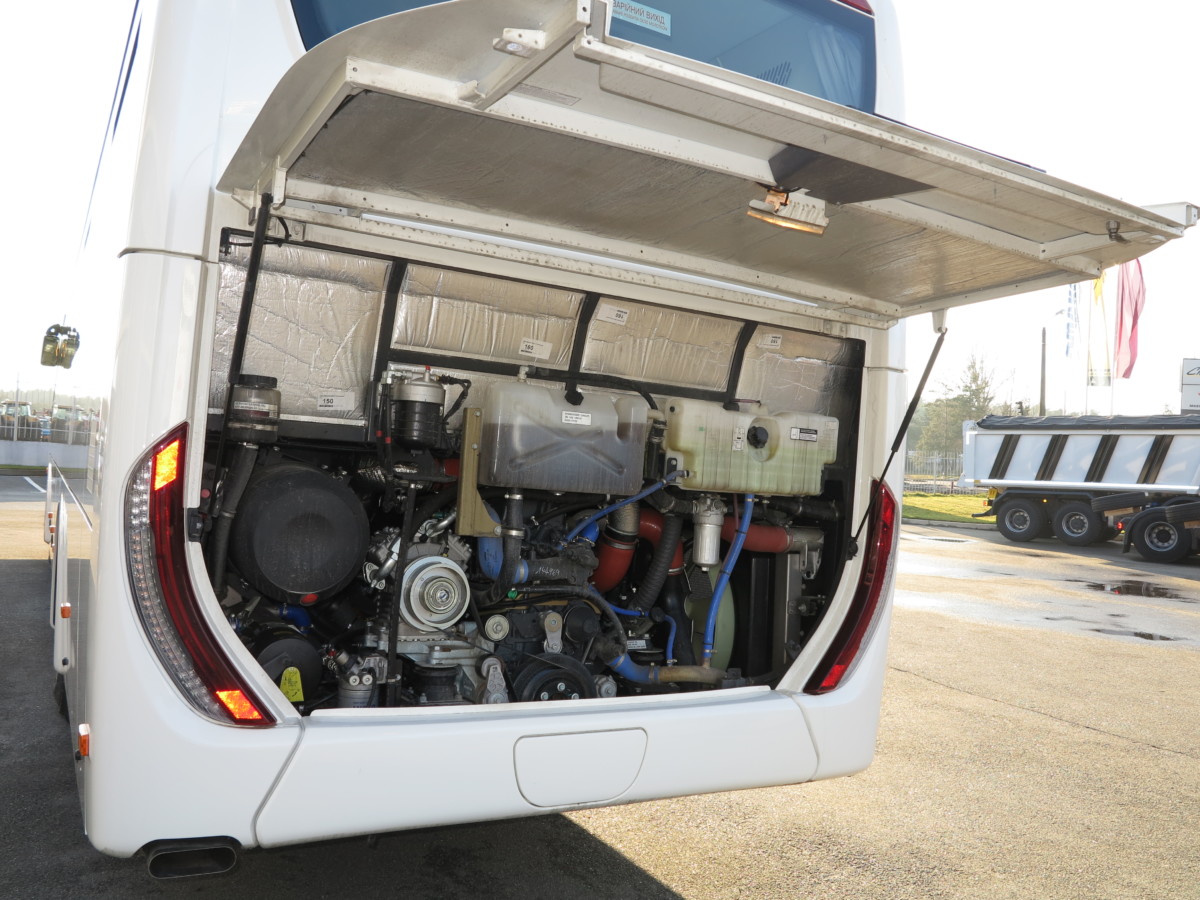 Подвеска пневматическая: передняя – на двух баллонах, задняя – на четырех. Есть функция самовыравнивания в зависимости от нагрузки на колеса справа или слева, спереди или сзади. Установлена и функция регулировки дорожного просвета. При достижении 15 км/ч автобус автоматически поднимается в транспортное положение. Это машина 2-го класса, а потому клиренс здесь уже большой – 230 мм, поэтому увеличить его можно только на 2-3 см.