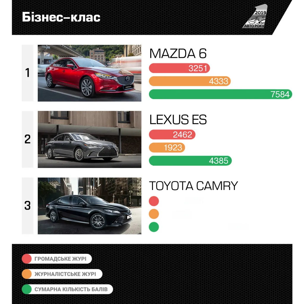 В бизнес-классе Toyota Camry не оценивалась, так как по регламенту конкурса, участник, победивший в одной из главных номинаций, не может претендовать на победу в классе.