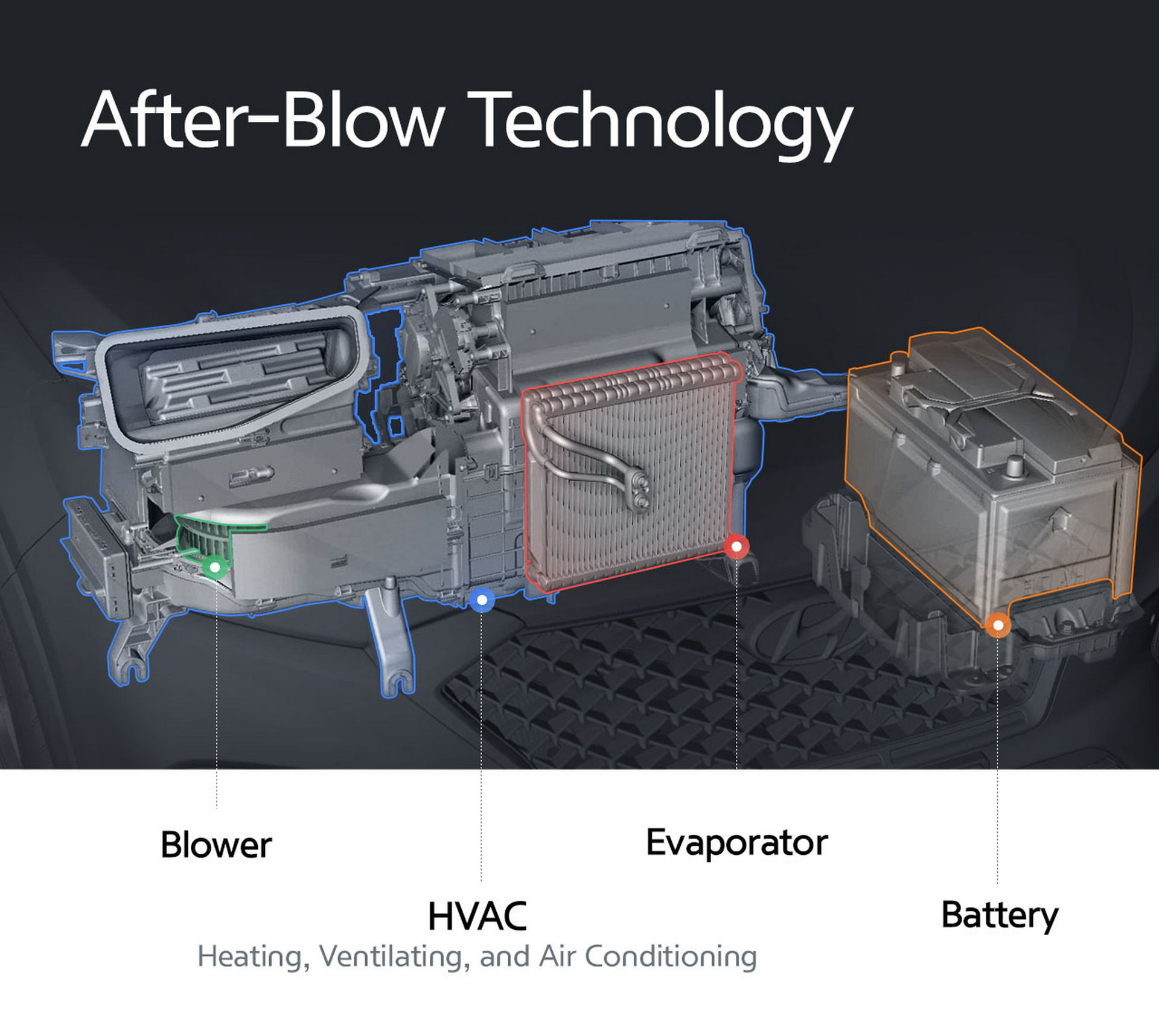 Система состоит из трех технологий кондиционирования – After-Blow, Multi-Air Mode и Fine Dust Indicator. Технология After-Blow избавляет от конденсата на испарителе и подавляет рост плесени в системе. Она запускается спустя 30 минут после выключения двигателя и работает на протяжении 10 минут. Ее действие основано на запуске в салон потока свежего воздуха, который и способствует предотвращению накопления влаги.