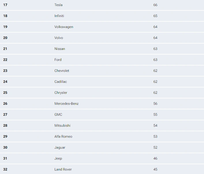 Конечно не обошлось и без аутсайдеров. Наименее надежными автомобилями признаны модели марки Land Rover. За несколько шагов от британской компании находятся Jeep и Jaguar, машины которых также не смогли впечатлить как экспертов, так и их пользователей.