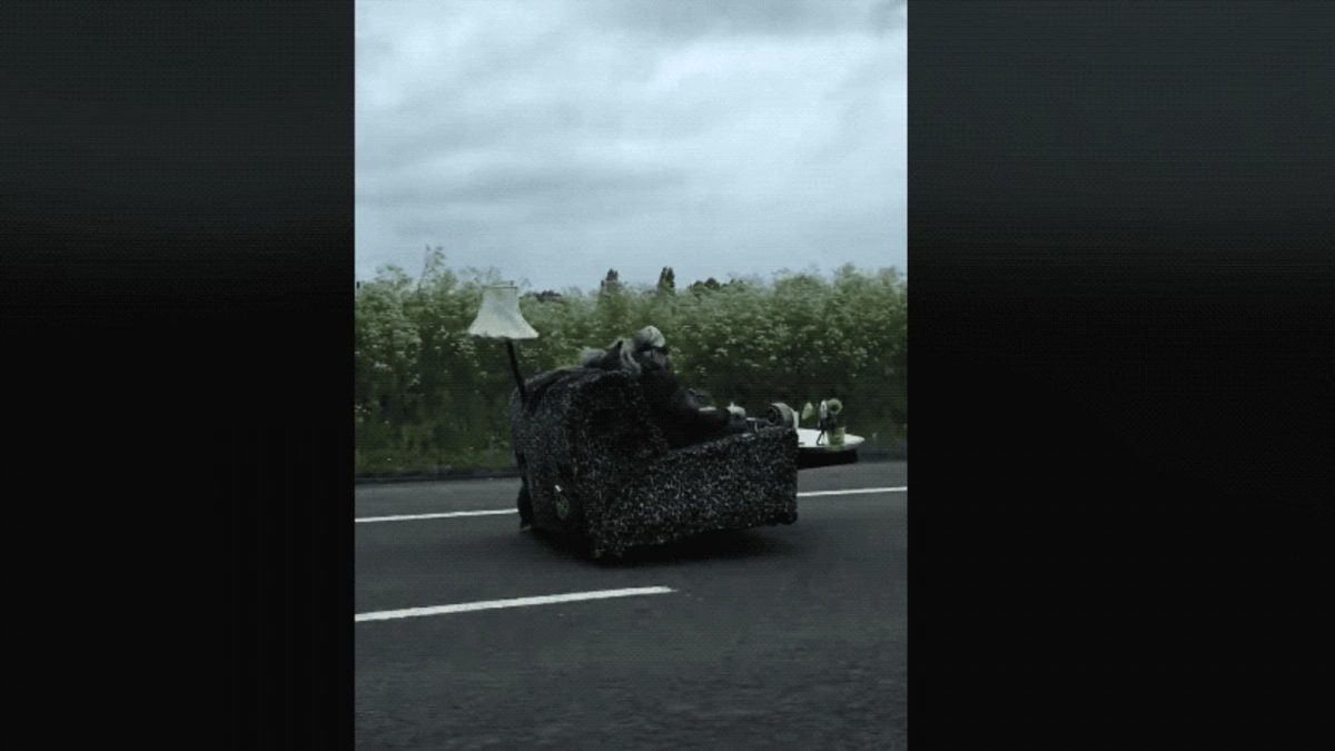 На первый взгляд может показаться, что пилотируют необычный болид известные шоумены Мэй и Хаммонд, но на самом деле журналистам пока не удалось выяснить, кто автор этой мебели на колесах. Думаем такому чудо-дивану позавидовал бы сам Гомер Симпсон.