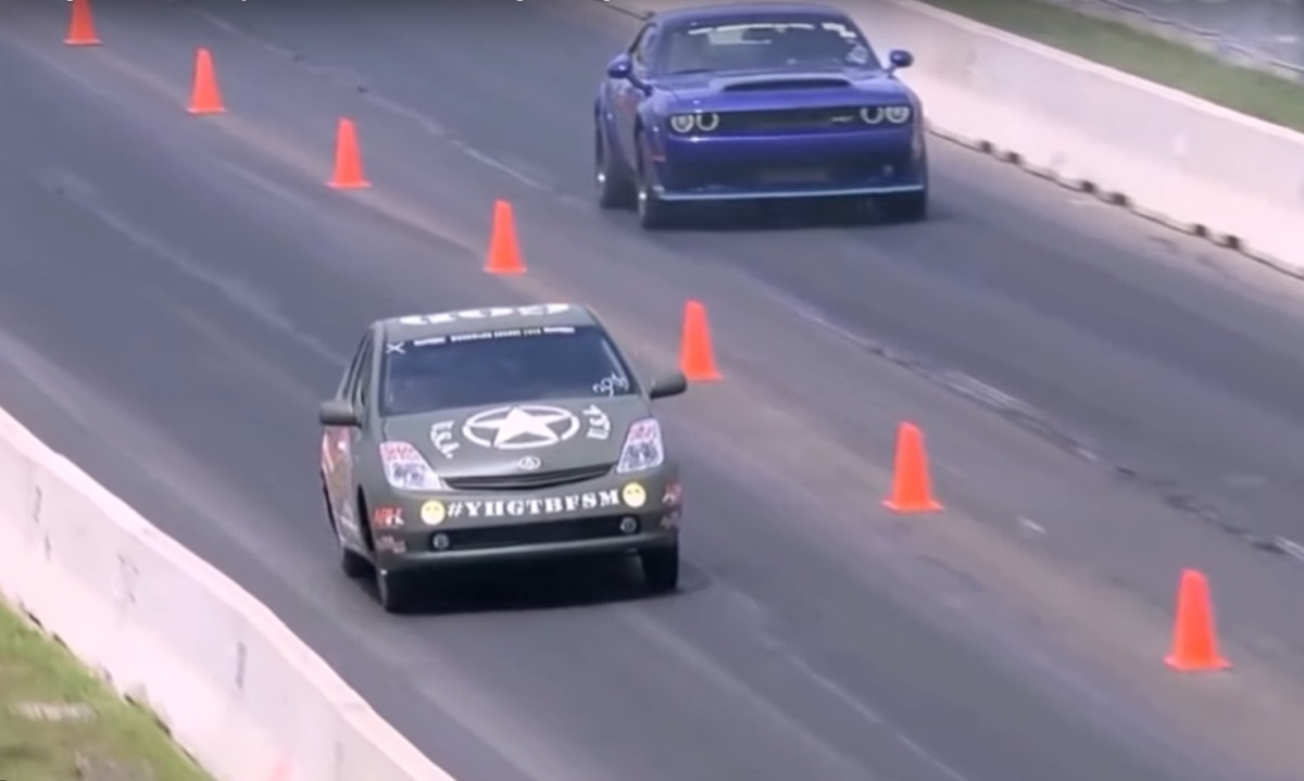 Драгрейсинг Приуса и Dodge Challenger с внезапным финалом (видео)
