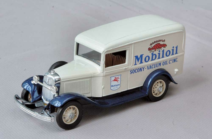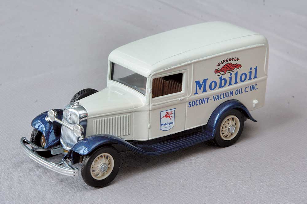 Если благодаря легендарному Ford T все американцы сели за руль, то Ford B прославился своим надежным и неприхотливым 3,6-литровым мотором V8. В первый год своего существования Ford B дебютировал сразу в двух версиях – с модернизированной «четверкой», которую модель унаследовала от своего предшественника Ford A, и с новым мотором V8. Впервые машина этого класса получила такой большой мотор. 65-сильная машина стоила всего $460. Интересно, что с незначительными модификациями этот мотор выпускался до 1953 года! Первоначально автомобиль предлагался с двумя кузовами на выбор – двухдверный седан или купе, но позже предложение расширили до 14 типов, в числе которых был и изображенный на иллюстрации фургон американской компании Standard Oil Company of New York (ныне ExxonMobil). За время производства покупателям предлагалось 14 различных кузовов. Эта машина востребована и сегодня. Она служит отличной базой для создания классических хот-роадов – антикварных машин с современной «начинкой». Модель в масштабе 1/43 изготовлена французской фирмой Eligor. Ориентировочная стоимость в Украине – 75–100 грн.