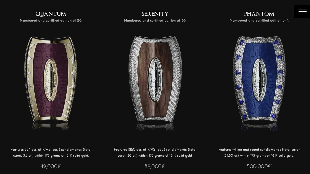 Например, ключ Phantom инкрустирован алмазами, общим весом 34,5 карата и покрыт 18-каратным золотом. Покупатели могут самостоятельно выбрать материалы для центральной секции ключа, в том числе несколько цветов кожи или дерева.