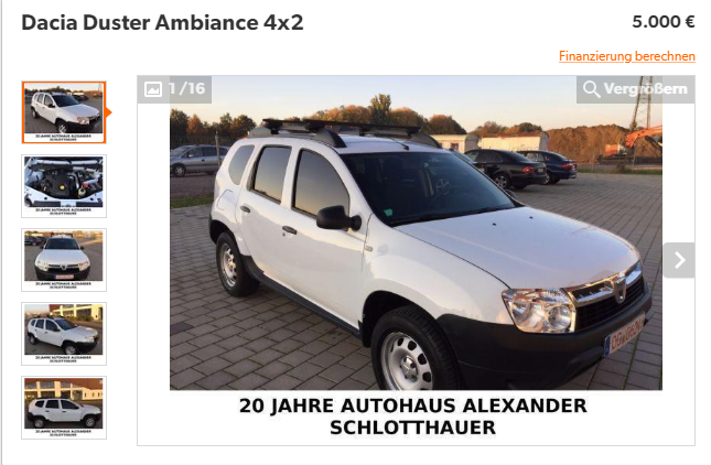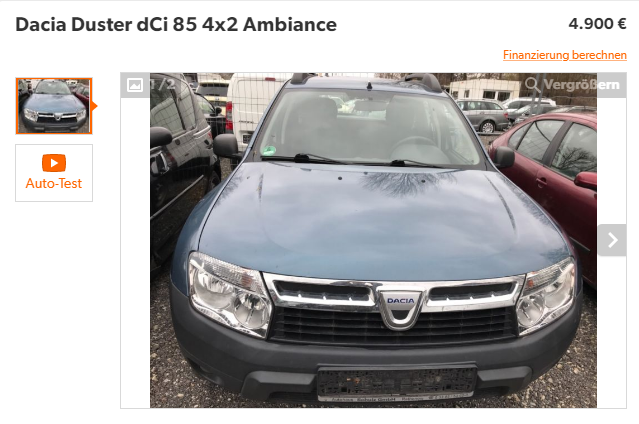 В таком случае можно рассмотреть вариант Дастера из Европы (там SUV продается под брендом Dacia). Имея на руках 5-5,5 тыс. евро, можно смело рассчитывать на вполне приличный экземпляр румыно-французского вседорожника. Ниже приведен список cсоответствующих машин, которые сейчас продаются на mobile.de.