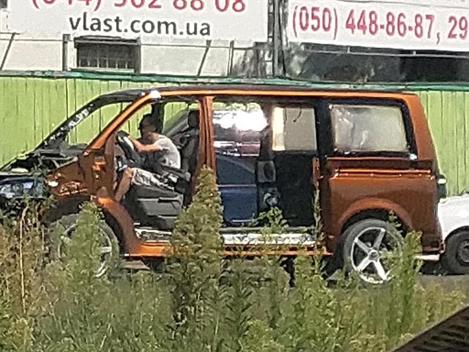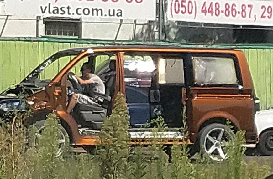 В Киеве средь бела дня засняли довольно необычный Volkswagen Transporter 6 поколения. Автомобиль спокойно передвигался по дороге в полуразобранном состоянии и даже без номерных знаков.
